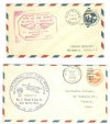 These two 1949 issues commemorate the Wright brothers. The top image, postmarked in Kitty Hawk, North Carolina, the site of the "first free controlled and sustained powered flight by man," commemorates the return of the Wright brothers' airplane from England to the United States. The lower image commemorates their first flight.