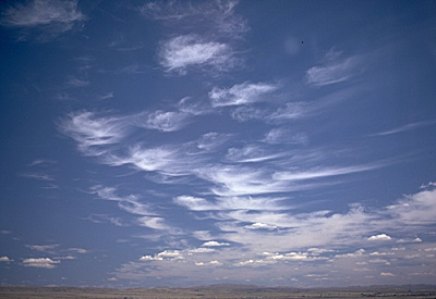Cirrus clouds are thin with fuzzy edges that look like feathers. They are high