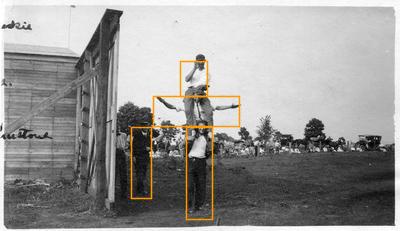 Walter Brookins (top), Frank Coffyn (middle), and Ralph Johnstone (bottom) on each others' shoulders.