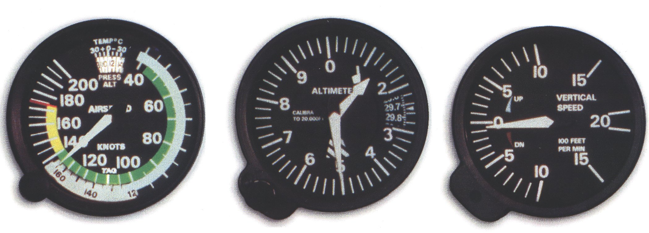 Three avionics instruments are the airspeed indicator (left), the altimeter (center),and the vertical speed indicator. The airspeed indicator is the aircraft's "speedometer." The altimeter measures pressure and displays this as height above sea level. The vertical speed indicator displays the rate of change in altitude. [larger image] Avionics refers to the electronic instruments on a fixed-wing or rotary aircraft or spacecraft that perform a variety of functions. These include navigation instruments; control instruments that aid in steering and controlling the craft; power indicators such as tachometers, torquemeters, and exhaust pressure ratio indicators; and performance indicators such as altimeters, vertical velocity indicators, and velocity gauges. The word is derived from the expression "aviation electronics" and also refers to the design and production of these instruments.